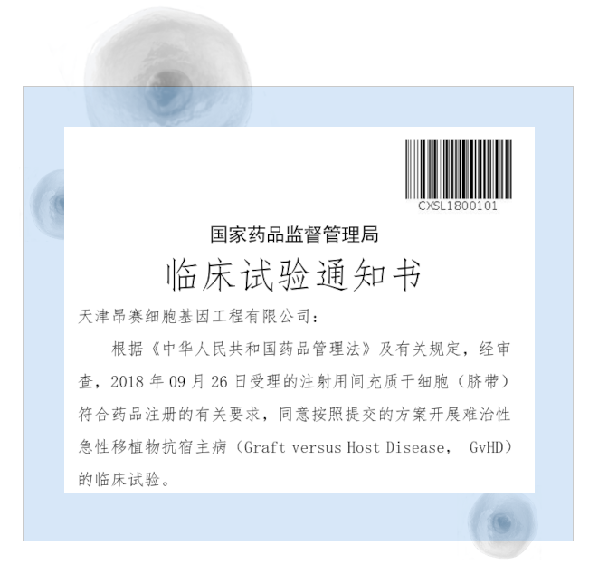 2025年11月3日, 天津昂賽細(xì)胞基因工程有限公司申報(bào)的注射用間充質(zhì)干細(xì)胞(臍帶)治療難治性急性移植物抗宿主病(aGvHD)兒童患者的適應(yīng)癥獲得國(guó)家藥品監(jiān)督管理局臨床試驗(yàn)?zāi)驹S可